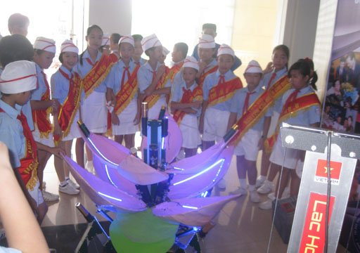 Rất đông các đoàn viên và các bạn nhỏ xem robot trường Lạc Hồng biểu diễn