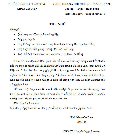 Khoa Cơ Điện: Thư ngỏ V/v Góp ý chuẩn đầu ra chất lượng cao
