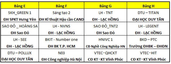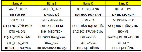 Nguyên tắc chia bảng: ưu tiên các đội cùng trường không cùng bảng thi đấu vòng 1; trường có nhiều đội tham dự hơn sẽ bốc thăm trước; Đại diện của đội thi bốc thăm chọn vị trí Bảng đấu (A ÷ H); Tiếp theo, bốc thăm chọn vị trí trong bảng đấu được đánh số: 1, 2, 3, 4;