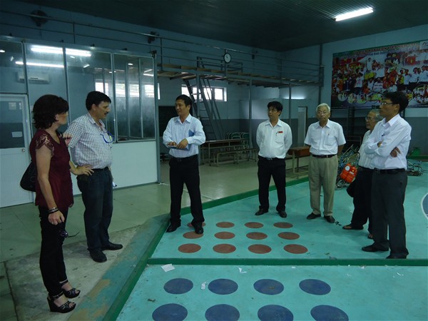 Ts Nguyễn Vũ Quỳnh giới thiệu cơ sở vật chất của trường cho khách tham quan