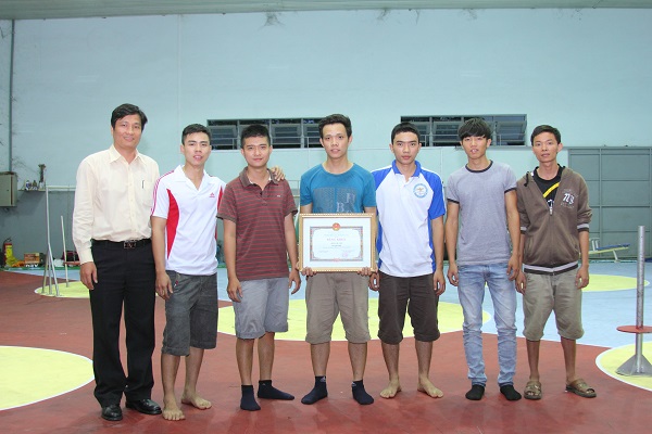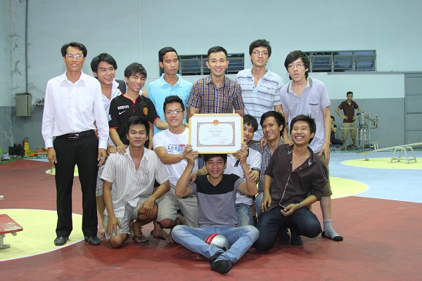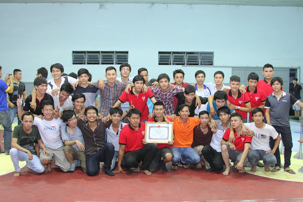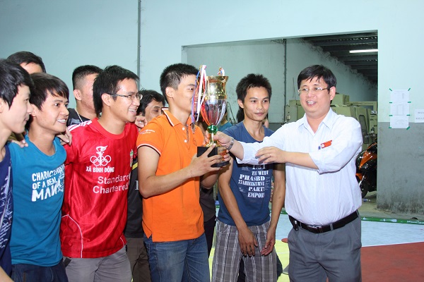 ThS. Lâm Thành Hiển (góc phải) và TS. Nguyễn Vũ Quỳnh (góc trái) hòa cùng niềm vui với đội thắng cuộc