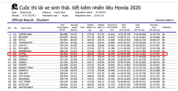 Đại học Lạc Hồng, xếp vị trí thứ 8 về Cuộc thi Lái xe Sinh thái, Tiết kiệm nhiên liệu (Honda EMC 2020).