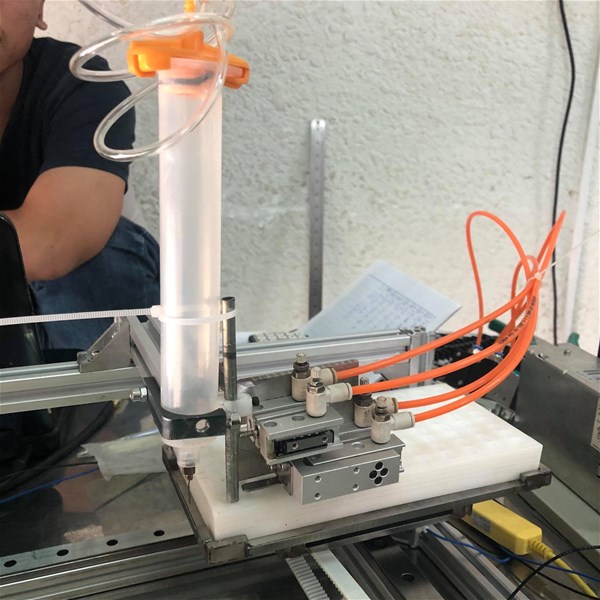 Giải pháp này đã được chuyển giao công nghệ cho Công ty Hualon Việt Nam, tính mới của sản phẩm này là: Lượng keo nhỏ vào mỗi sản phẩm bằng nhau; keo nhỏ chính xác không bị nhỏ ra ngoài dẫn như phương pháp truyền thống; cải thiện điều kiện làm việc; hiệu quả kinh tế là giảm số công nhân làm việc từ 2 người còn 1 người; giảm gấp đôi thời gian tạo ra sản phẩm trung bình từ 2,8s/sp còn 1,2s/sp.