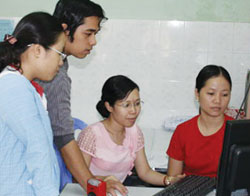 Hải Yến (ngồi giữa) đang hướng dẫn các nhân viên Bệnh viện đa khoa Đồng Nai thao tác phần mềm