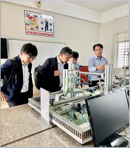 Sau khi gặp mặt cùng sinh viên, các thành viên đoàn thăm quan các phòng thực hành của Khoa và rất hứng thú với các thiết bị và máy mà thầy và trò đã chế tạo.