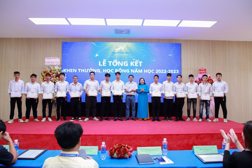 Hình 4: NGƯT. TS Nguyễn Thị Thu Lan - Phó Hiệu trưởng Trường Đại học Lạc Hồng và đại diện doanh nghiệp trao thưởng cho sinh viên đạt thành tích cao năm học 2022-2023
