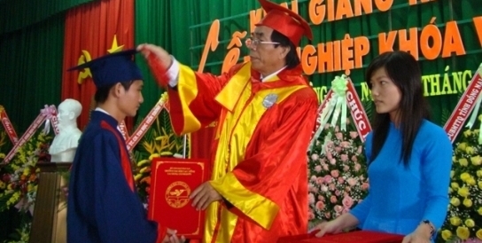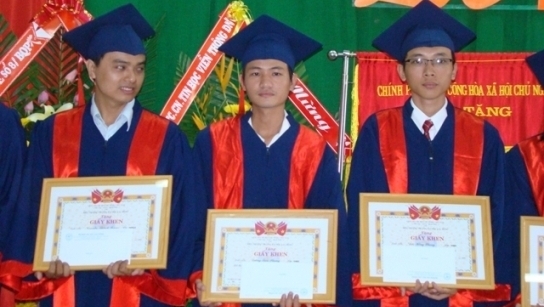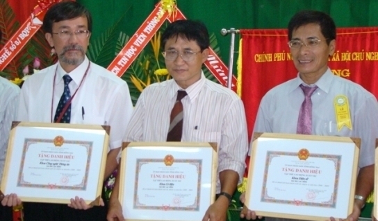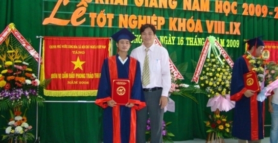 Sinh viên Trương Thanh Inh (đứng giữa) nhận bằng khen tốt nghiệp thủ khoa niên khóa 2004 - 2009 ngành Điện Công Nghiệp