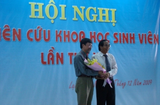 TS Trần Hành - Hiệu trưởng nhà trường (người mặc áo trắng) tặng hoa cho PGS TS Trần Văn Lăng chủ tịch hội đồng giám khảo NCKH sinh viên 2009 khối ngành kỹ thuật