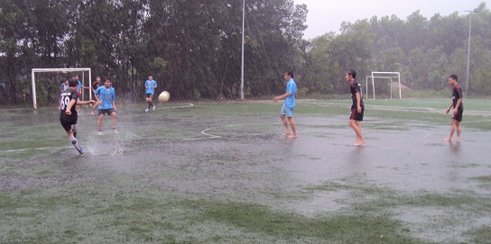 Trời mưa nặng hạt, mặt sân ngập nước, các cầu thủ liên tục trượt ngã