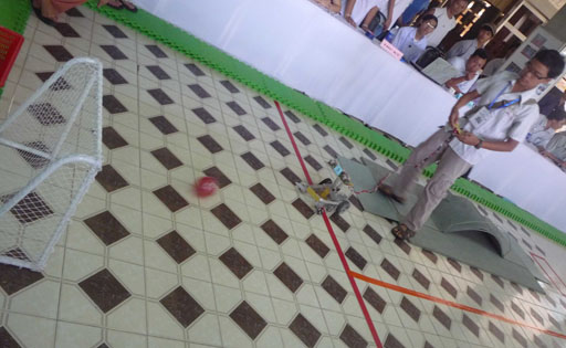 Với chủ đề “Robot đá bóng”, Robot phải thực hiện nhiệm vụ vượt qua chướng ngại vật và sút bóng vào khung thành, trong thời gian 10 phút robot nào sút được nhiều bóng vào khung thành, Robot đó chiến thắng.