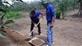 Hình 1: ông Chuyến (áo bộ đội) đang cùng sinh viên tình nguyện khai móng ngôi nhà mới