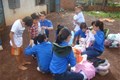 Hình 3: Các bạn sinh viên tình nguyện thử đồ cho thiếu nhi địa phương