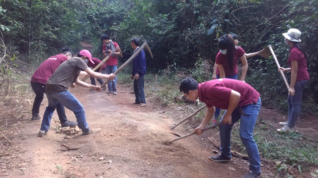 Hình 3- Phối hợp cùng người dân địa phương san lấp đoạn đường bị sụt, lún