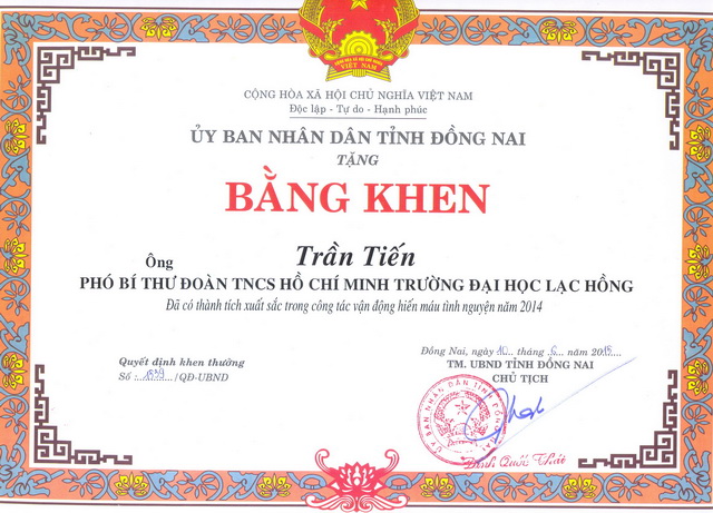Đ/c Trần Tiến - Phó Bí thư Đoàn trường được UBND tỉnh Đồng Nai tặng bằng khen; Đ/c Nguyễn Võ Sơn – Chuyên viên phòng tư vấn tuyển sinh trường được Hội Chữ thập đỏ tỉnh Đồng Nai tặng quà cho cá nhân có thành tích hiến máu tình nguyện từ 15 lần trở lên.
