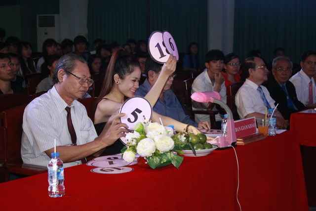 Hình 1: Đại diện Đảng ủy, Ban Giám hiệu và Đoàn Thanh niên tặng hoa Ban Giám khảo trong đêm chung kết