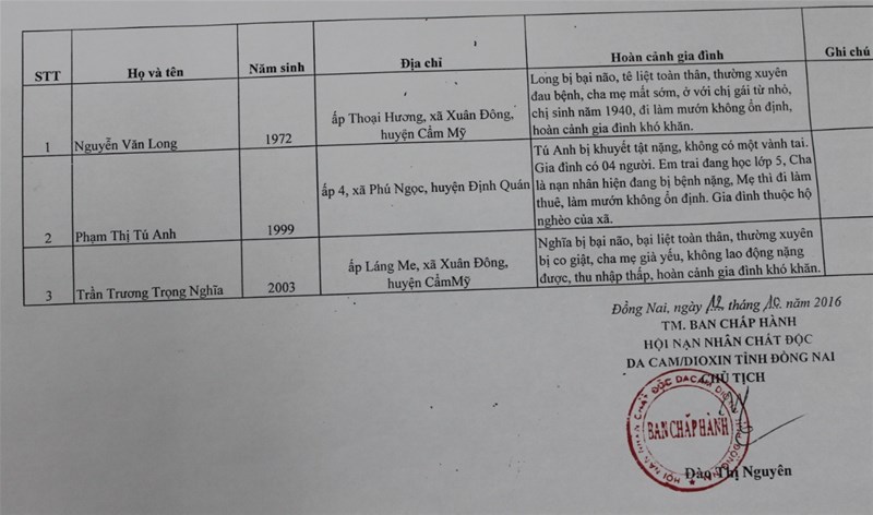 Công tác chăm lo cho các gia đình nhiễm chất độc da cam được Thầy Hiệu trưởng và nhà trường rất quan tâm, Thầy Hiệu trưởng và nhà trường trợ cấp thường xuyên cho 20 nạn nhân chất độc da cam tại huyện Cẩm Mỹ và huyện Định Quán.