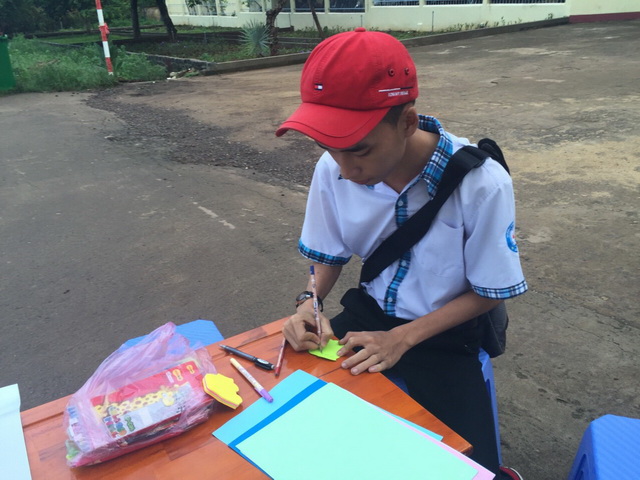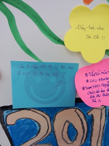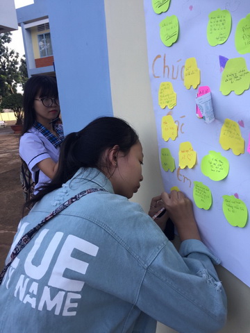 HÌnh 2: Một em học sinh đang dán các lời chúc của mình đến các bạn cùng trường lên bảng khẩu hiệu
