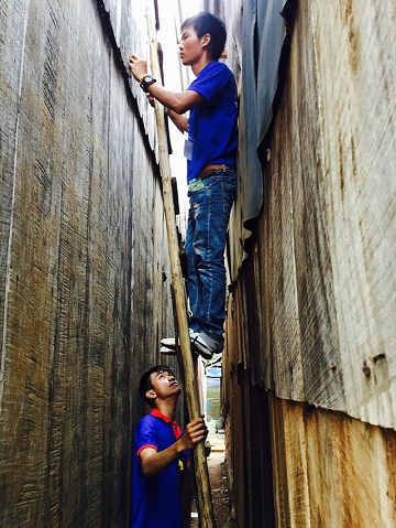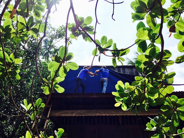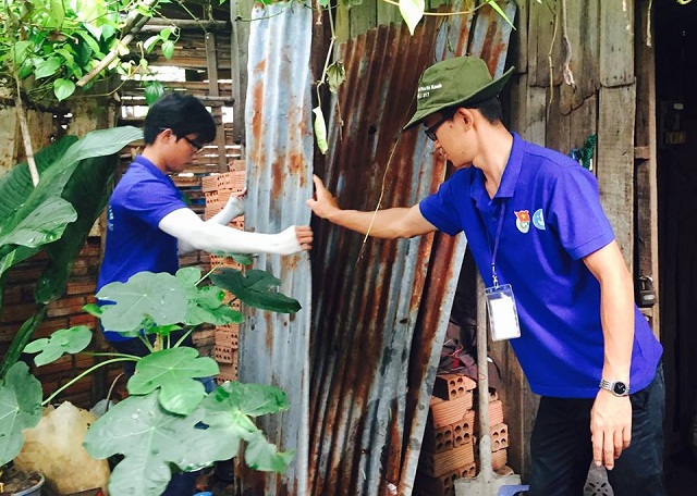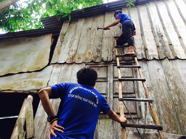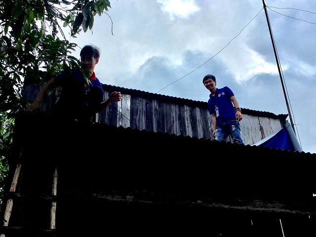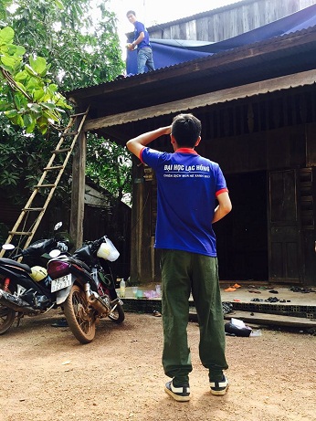 Hình 4- SV Vũ Đức Hòa - Sinh viên ngành Dược đang tiến hành sữa chữa chống dột cho gia đình cụ già neo đơn