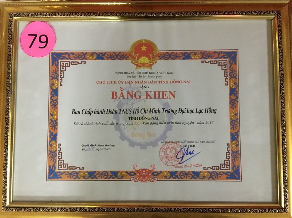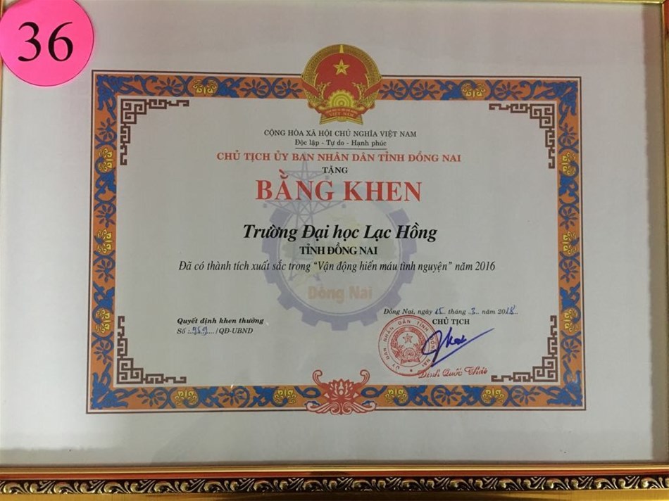 Hình 3: Trường Đại học Lạc Hồng được UBND tỉnh Đồng Nai tặng bằng khen có thành tích xuất sắc trong “Vận động hiến máu tình nguyện” năm 2016