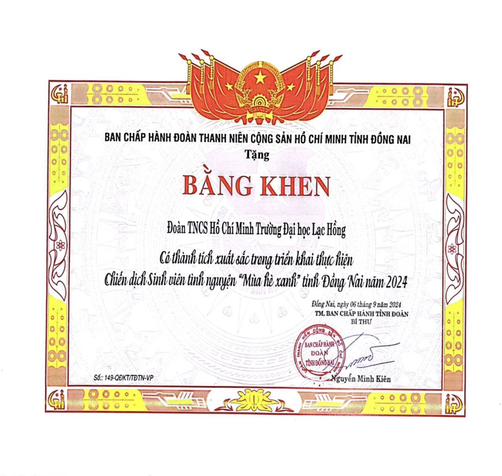 Ban Thường vụ Đoàn trường xuất sắc với Bằng khen của Tỉnh đoàn có thành tích xuất sắc trong Chiến dịch Tiếp sức mùa thi và Chiến dịch Mùa hè xanh năm 2024.