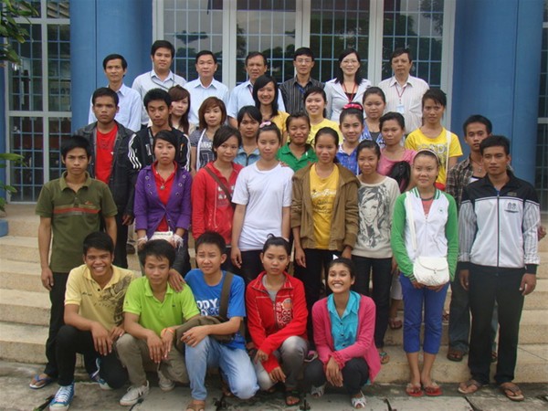 Các em chụp hình với các anh chị là sinh viên Lào hiện đang học tại trường