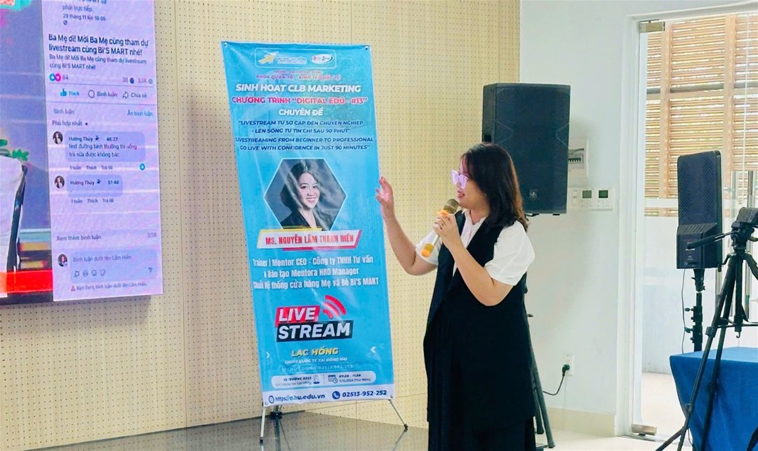 Sáng ngày 11/12/2025, tại Phòng B203 – Cơ sở 1 – Trường Đại học Lạc Hồng, Câu lạc bộ Marketing – Khoa Quản trị – Kinh tế quốc tế đã tổ chức buổi sinh hoạt chuyên đề với chủ đề “Livestream từ sơ cấp đến chuyên nghiệp – Lên sóng tự tin chỉ sau 90 phút”. Chương trình thu hút sự tham gia đông đảo của sinh viên yêu thích lĩnh vực Marketing, truyền thông và sáng tạo nội dung số.