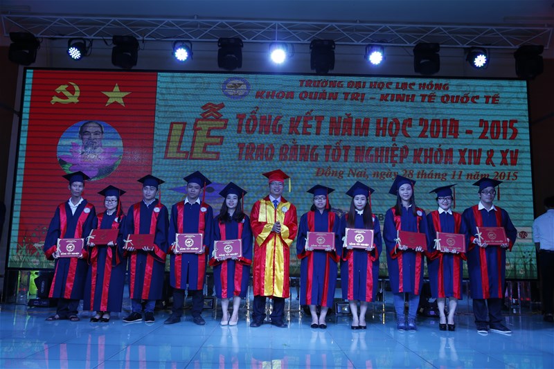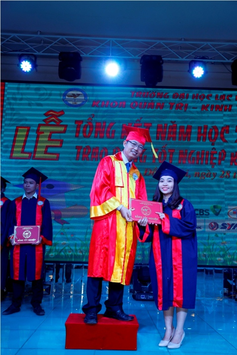Phần cuối buổi lễ là nghi thức trao bằng tốt nghiệp cho các tân Cử nhân. Trong bộ lễ phục truyền thống của trường, từng đợt tân Cử nhân lên lễ đài nhận bằng tốt nghiệp từ thầy NGND-TS. Đỗ Hữu Tài, Chủ tịch HĐQT- Hiệu trưởng trường ĐH Lạc Hồng; thầy TS Nguyễn Văn Tân - Trưởng Khoa QT- KTQT và các thầy cô là giáo sư, phó giáo sư, tiến sĩ trong niềm hân hoan, sung sướng.