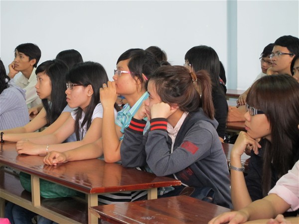 Các tân sinh viên đang lắng nghe thầy cô phổ biến nội quy, quy chế