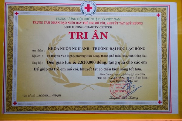 Nhằm tạo cơ hội cho các bạn sinh viên hiểu rõ hơn về cuộc sống của trẻ mồ côi, khuyết tật, giúp họ có thêm niềm tin vào cuộc sống và động lực hòa nhập với cộng đồng, vào lúc 08h00 ngày 23 tháng 05 năm 2014, Ban chấp hành Đoàn – Hội sinh viên khoa Ngôn ngữ Anh đã tổ chức chuyến thăm và tặng quà cho trẻ em đang được nuôi dưỡng tại Trung tâm Nhân đạo Quê Hương – Thị xã Dĩ An, tỉnh Bình Dương.
