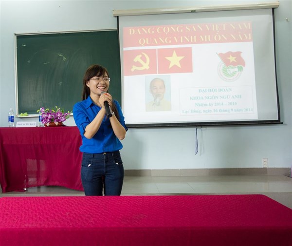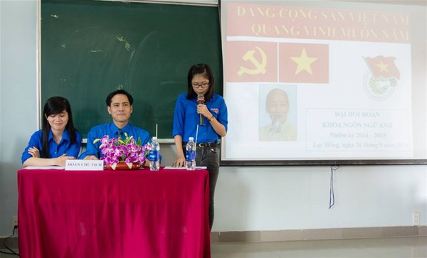Được sự đồng ý của Chi bộ 6, Đoàn trường Đại học Lạc Hồng và Lãnh đạo Khoa Ngôn Ngữ Anh, vào lúc 8h30 ngày 26 tháng 09 năm 2014, BCH Đoàn Khoa Ngôn Ngữ Anh đã tổ chức Đại hội Đoàn khoa Ngôn Ngữ Anh nhiệm kỳ 2014-2015 tại giảng đường SN-C110, trường Song ngữ Lạc Hồng.