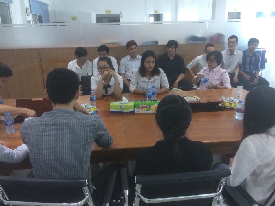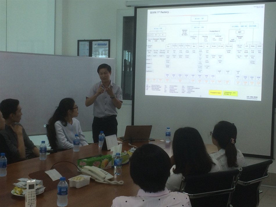 Trước khi được hướng dẫn tham quan thực tế công ty, các em sinh viên đã được sắp xếp một cuộc gặp gỡ với Ban lãnh đạo công ty, được giới thiệu nhiều thông tin về công ty TNHH Dong Jin Textile Vina, quy trình sản xuất, đồng thời được giải đáp rất nhiều thắc mắc xoay quanh các vấn đề về tuyển dụng.