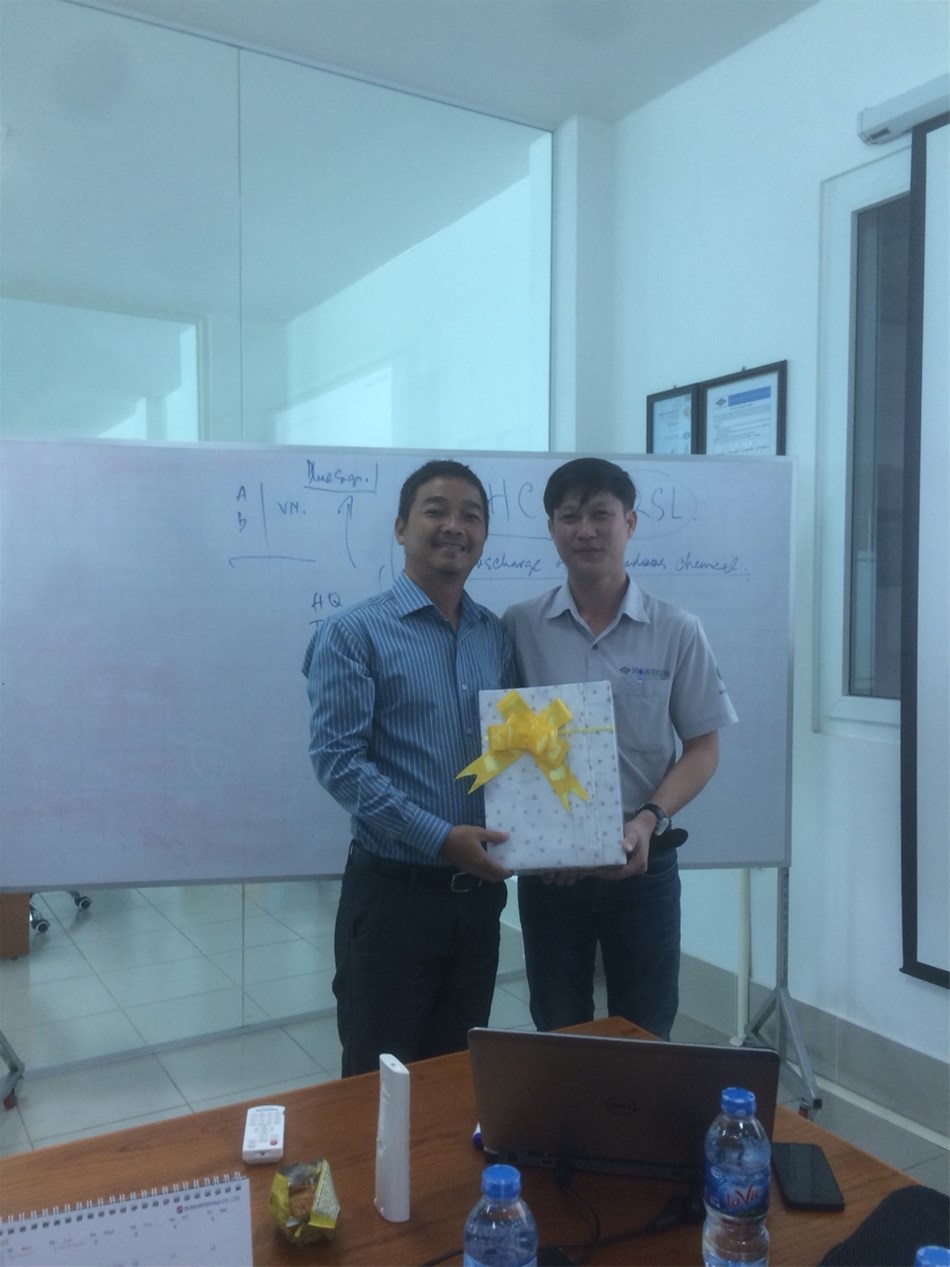 Thầy Phạm Thanh Bình tặng quà cho đại diện công ty Dong Jin Textile Vina