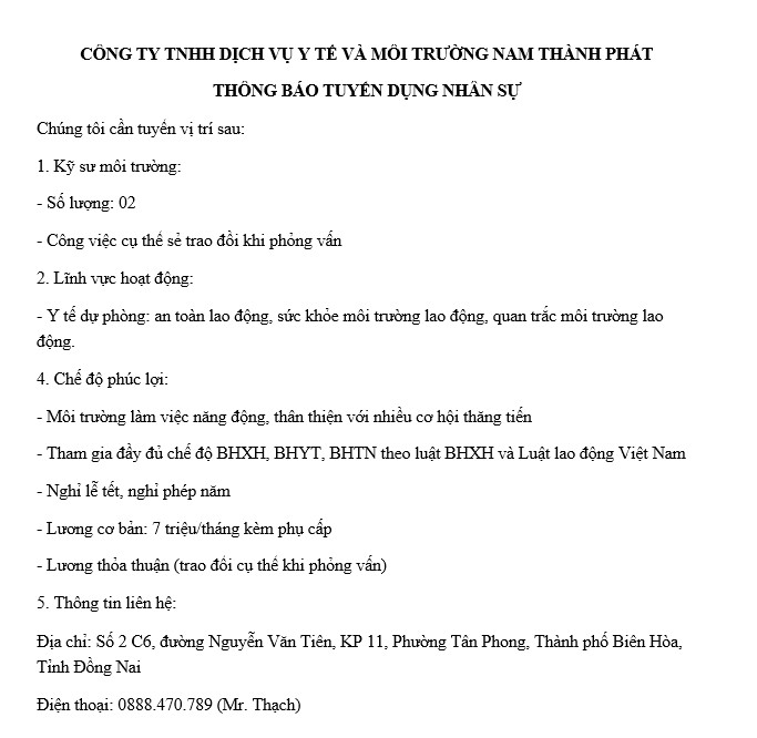 Công ty TNHH dịch vụ y tế và môi trường Nam Thành Phát tuyển dụng kỹ sư môi trường