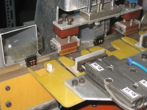 - Sau khi sản phẩm đã ổn định trên băng chuyền, một tay máy khí nén sẽ vận chuyển sản phẩm từ băng chuyền sang máng ngang, mỗi lần chỉ di chuyển một sản phẩm. Sau khi sản phẩm đã ổn định trên máng ngang, cơ cấu răng lược sẽ di chuyển sản phẩm đến các vị trí kiểm tra lỗi A, một thiết bị kiểm điện do Nec Tokin cung cấp (gọi tắt là TBK) sẽ báo rằng sản phẩm là OK hay NG. Nếu OK thì sản phẩm sẽ tiếp tục qua phần kiểm tra lỗi B, còn nếu NG thì sản phẩm sẽ được một cylinder đẩy ra thùng lỗi A. Tại vị trí kiểm tra lỗi B, nếu OK thì sản phẩm sẽ được đẩy qua phần cuối của máng chờ cho tay máy gắp đi, còn nếu NG thì sản phẩm sẽ được một cylinder đẩy ra thùng lỗi B.