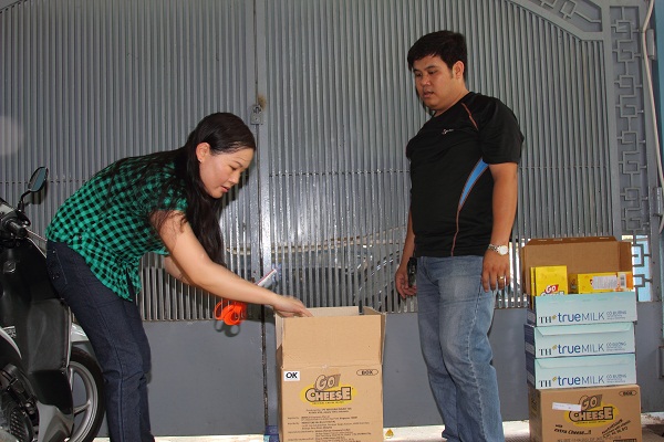 Đại diện Tổ trưởng Công đoàn chu đáo kiểm tra quà, để không bỏ sót phần của cháu nào