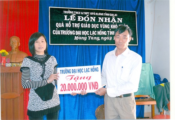 Thực hiện theo công văn số 182/CĐN ngày 26/08/2013 của Công Đoàn Giáo Dục Việt Nam về việc hỗ trợ giáo dục miền núi, vùng sâu, vùng xa, vùng đặc biệt khó khăn năm học 2013 – 2014, Công đoàn trường Đại học Lạc Hồng đã tổ chức quyên góp các Công đoàn viên trong toàn trường với số tiền 20 triệu đồng. Được sự hướng dẫn của Công Đoàn Ngành Giáo Dục tỉnh Gia Lai, BCH đã trao số tiền quyên góp trên cho trường THCS & THPT Kpa-Klơng là 1 trường có hoàn cảnh khó khăn thuộc huyện MangYang tỉnh Gia Lai. Đây là chương trình hỗ trợ thường xuyên và mang ý nghĩa nhân văn cao cả, thiết thực của Công đoàn trường Đại học Lạc Hồng cho giáo dục miền núi, vùng sâu, vùng xa.