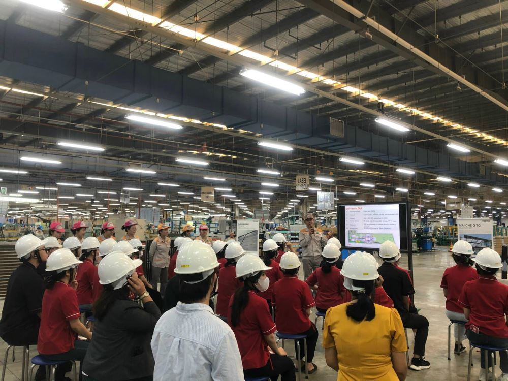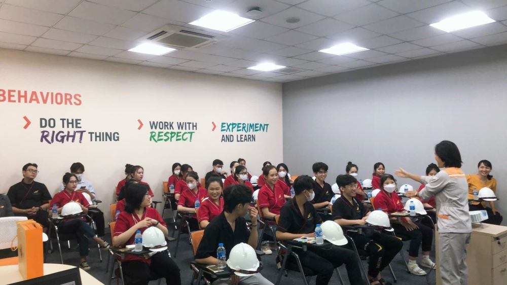 Sinh viên ngành Nhật Bản học lắng nghe hướng dẫn ngay trong nhà máy