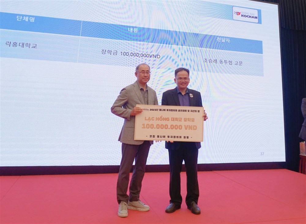 Tại chương trình này PGS.TS Nguyễn Thanh Lâm - Phó Hiệu trưởng Trường Đại học Lạc Hồng cùng đại diện ngành Hàn Quốc học đã cùng đến tham dự và nhận số tiền tại trợ cho quỹ học bổng trị giá 100 triệu VNĐ từ Hiệp hội doanh nghiệp Hàn Quốc tại Đồng Nai.