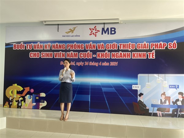 Vào sáng ngày 24/4/2021, Trường Đại học Lạc Hồng phối hợp với ngân hàng MB tổ chức: Buổi tư vấn kỹ năng phỏng vấn và Giới thiệu giải pháp số cho sinh viên năm cuối – Khối ngành kinh tế. Đây là hoạt động thường niên của trường nhằm hướng tới sinh viên, đặc biệt các bạn sinh viên năm cuối. Từ đó giúp cho các bạn sinh viên học hỏi thêm các kỹ năng, cũng như có cơ hội thực tập trong môi trường tốt nhất. Giúp sinh viên có công việc ngay trong quá trình thực tập và phát triển nghề nghiệp trong tương lai.