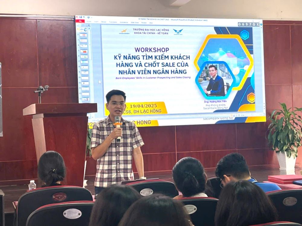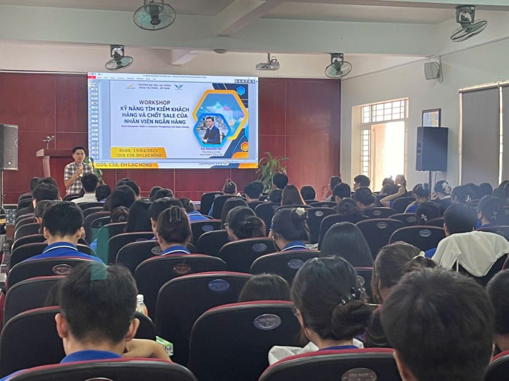 Vào sáng ngày 19 tháng 4 năm 2025, Khoa Tài chính – Kế toán, Trường Đại học Lạc Hồng đã tổ chức thành công workshop với chủ đề "Kỹ năng tìm kiếm khách hàng và chốt sale của nhân viên ngân hàng." Chương trình diễn ra tại phòng I209, CS6, Đại học Lạc Hồng, thu hút sự tham gia đông đảo của các sinh viên ngành Tài chính – Kế toán.