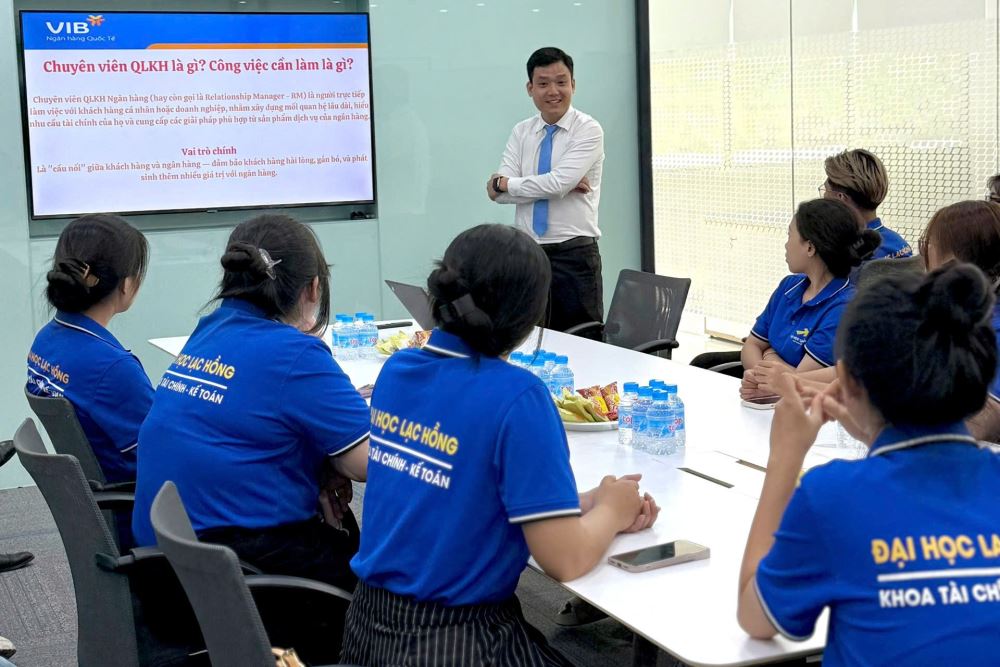 Nhằm giúp sinh viên ngành Tài chính – Ngân hàng có cơ hội tiếp cận thực tế, nâng cao kiến thức chuyên môn và hiểu rõ hơn về môi trường làm việc trong lĩnh vực ngân hàng, sáng ngày 09/5/2025, Khoa Tài chính – Kế toán, Trường Đại học Lạc Hồng đã tổ chức chương trình tham quan, thực hành thực tế học phần tại Ngân hàng Quốc tế – VIB chi nhánh Đồng Khởi (Biên Hòa, Đồng Nai) cho tập thể sinh viên lớp 24NH112.
