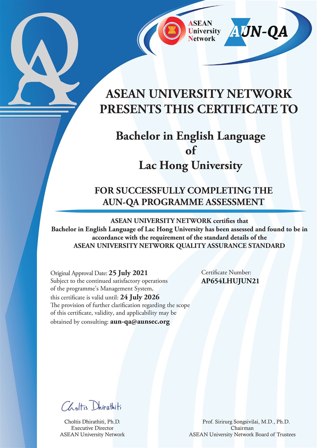 Đặc biệt, Đại học Lạc Hồng luôn đặt việc kiểm định chất lượng chương trình đào tạo đạt chuẩn quốc tế AUN-QA (ASEAN University Network Quality Assurance) lên nhiệm vụ hàng đầu. Điều này khẳng định cam kết của nhà trường trong việc cung cấp một môi trường học tập chất lượng cao, giúp sinh viên phát triển toàn diện kỹ năng giao tiếp, dịch thuật, phiên dịch, và thích ứng linh hoạt với mọi môi trường làm việc. Sinh viên tốt nghiệp Ngôn ngữ Anh có thể tự tin đảm nhận các vị trí như nhân viên văn phòng, trợ lý giám đốc, chuyên viên marketing, hay biên/phiên dịch chuyên nghiệp, thậm chí là giáo viên ngoại ngữ.