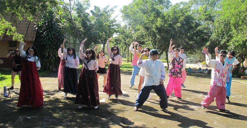 Sau chương trình giới thiệu ý nghĩa của buổi sinh hoạt “Chào đón tân sinh viên” cũng như giới thiệu thành phần khách mời tham dự, hoạt động văn nghệ đầu tiên được đông đảo các bạn sinh viên chờ đón là tiết mục nhảy hiện đại kết hợp với trang phục truyền thống Hanbook của Hàn Quốc. Đây cũng là tiết mục đạt giải 3 trong hội thi “Sắc màu Đông phương 2016”.