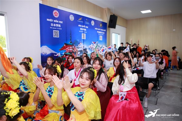 Sinh viên ngành Hàn Quốc học Trường Đại học Lạc Hồng vẫy cờ Việt Nam – Hàn Quốc cổ vũ cho các tiết mục biểu diễn tại buổi giao lưu.