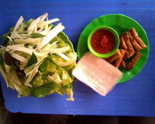 Màu trắng của bánh tráng mỏng, gam xanh của rau, quả, màu cam của nước mắm, đỏ vàng của những cuốn chả, hòa trộn vào nhau tạo nên một món bánh tuyệt cú mèo. Đan hai que chả vào nhau,một tay giữ tay kia dùng sức tuốt những miếng chả nhỏ ra dĩa cách cuốn bánh cũng giống như cách người ta ăn chả cuốn vậy. Lấy miếng bánh tráng được cắt làm tư bày trên dĩa cho cuốn chả lụi nhỏ vào, cho chút rau sống, đôi ba miếng dưa leo hoặc xoài sống  tùy vào khẩu vị từng người. Cuốn chặt, vừa miệng chấm với nước mắm đậu phộng thì khỏi chê.