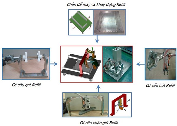 • Cơ cấu giữ Refill: xylanh đôi được gá cố định trên khung gá thông qua hai tấm gá 1 và 2. Ở đầu xylanh đôi được gắn một chi tiết giữ Refill, khi xylanh đi xuống sẽ ép chặt các tờ Refill.