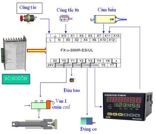 • Bộ đếm, van đảo chiều khí nén, relay trung gian, động cơ DC.