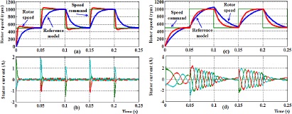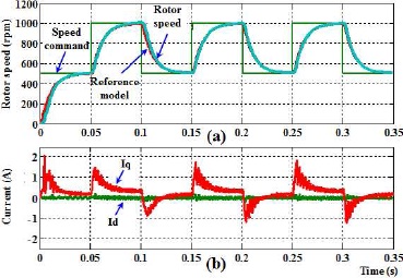 Speed response (a) and current response (b) in simulation with Adaptive Fuzzy control was used at normal load