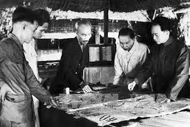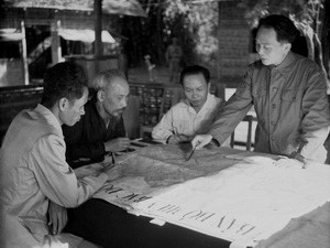 Hình 3: Đại tướng Võ Nguyên Giáp  trình bày với Chủ tịch Hồ Chí Minh và các đồng chí lãnh đạo Đảng, Nhà nước kế hoạch mở Chiến dịch Điện Biên Phủ năm 1954