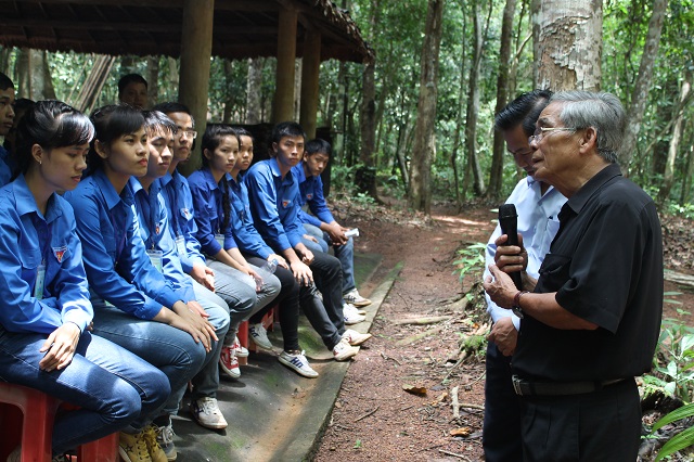 Đồng chí Nguyễn Trùng Phương - Bí thư Đảng ủy trường trò chuyện cùng các bạn đoàn viên về lịch sử hình thành và chiếu đấu anh dũng của Khu ủy Miền Đông tại chiến khu Đ tỉnh Đồng Nai.